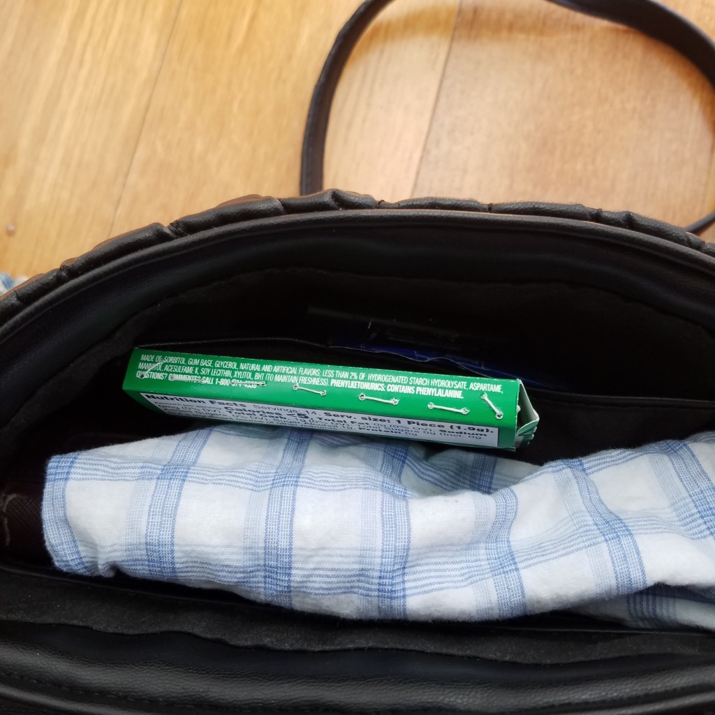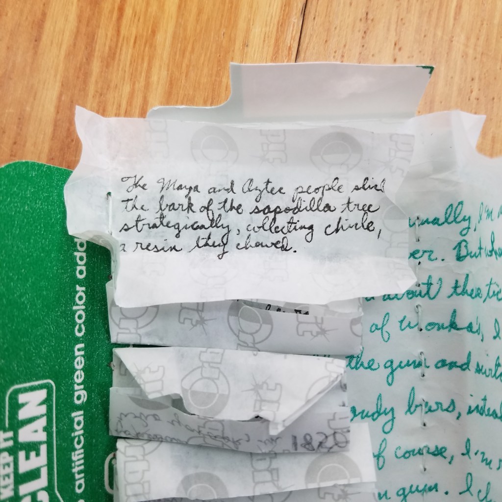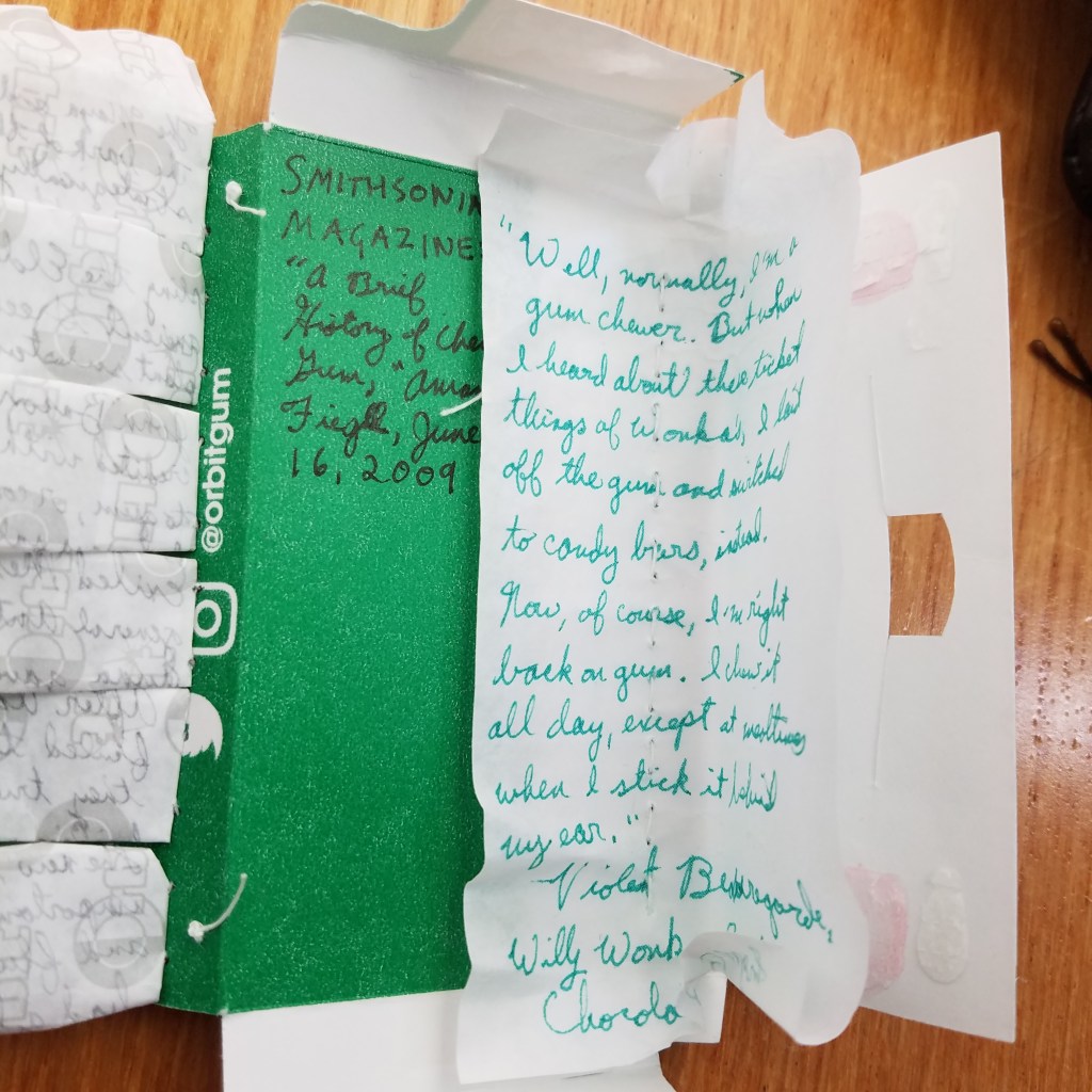 A packet of gum, chewed, the remainder sewn into a book involving gum origin facts and a quote from Willy Wonka and the Chocolate Factory.