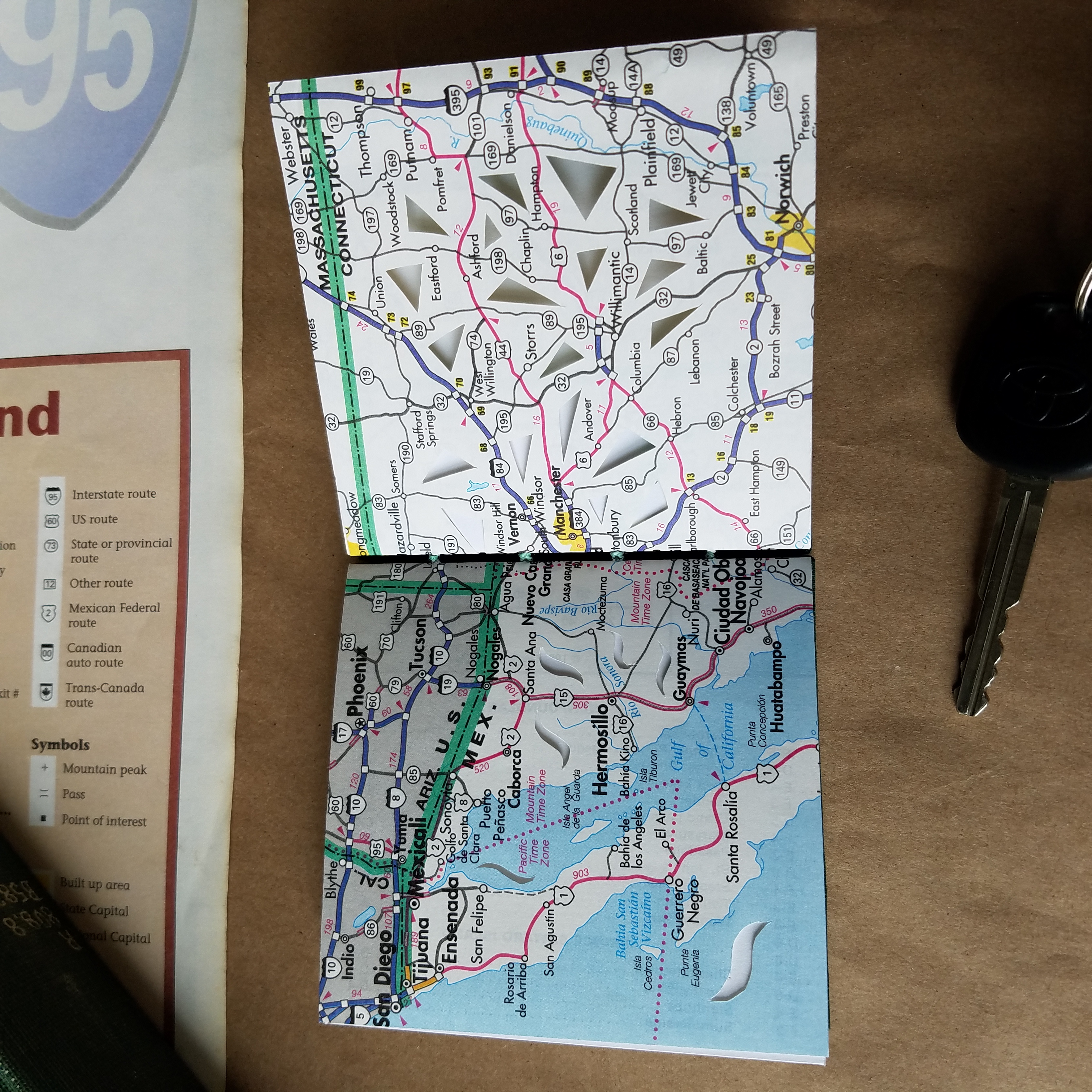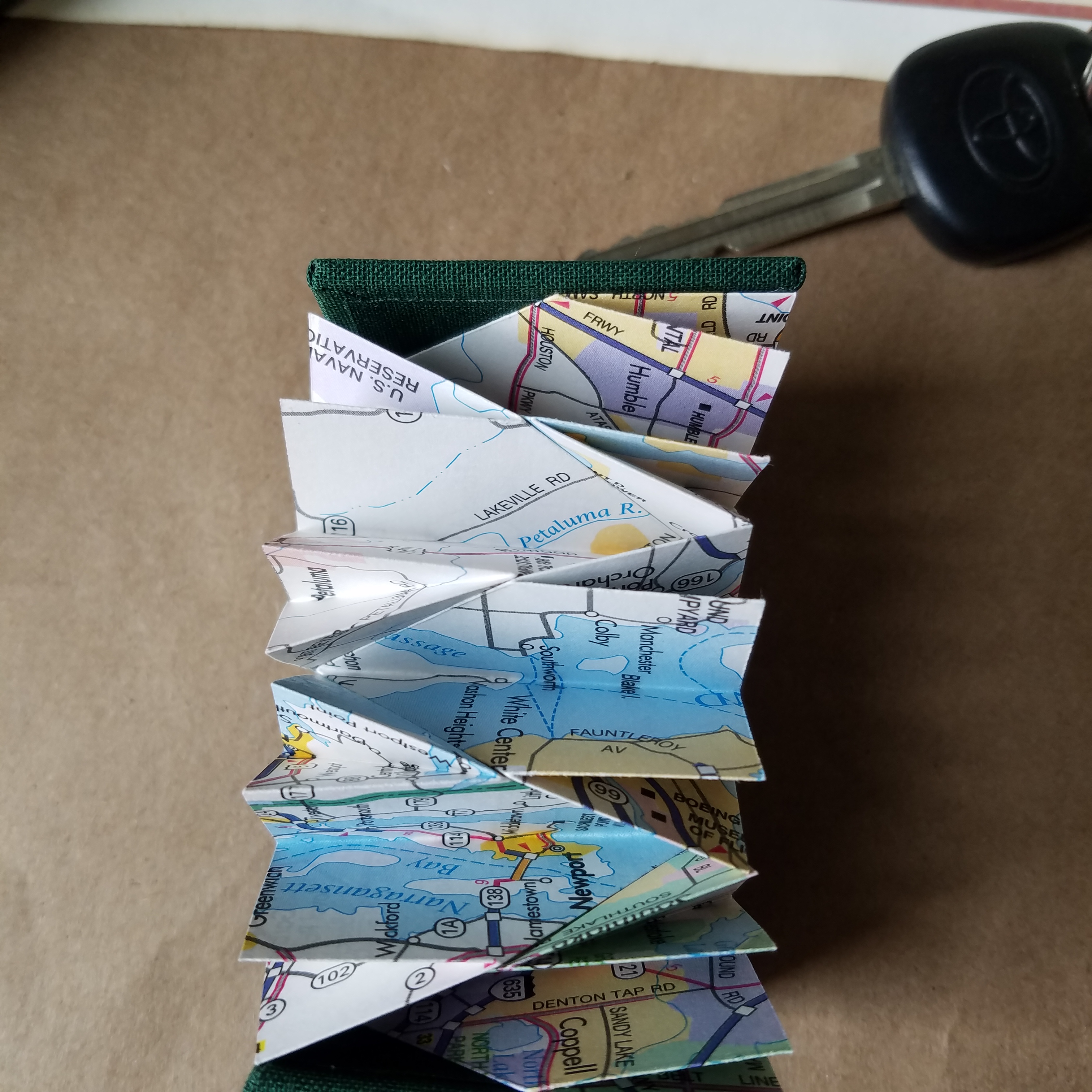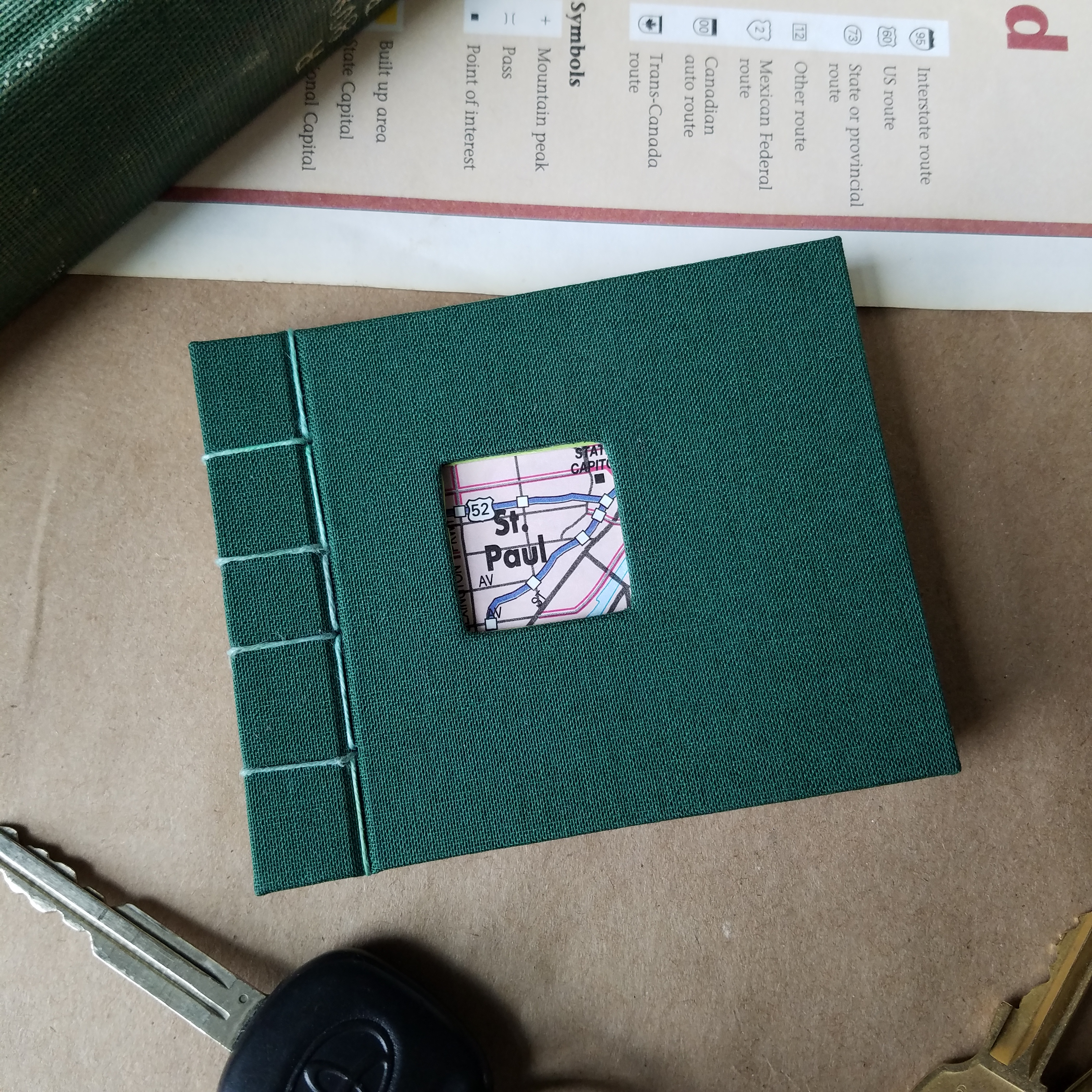 From smallest to largest, Maps 1 uses a Turkish map fold within hardcovers and a keyhole cutout. Maps 2 has a stab binding with hard covers, and a cutout around St. Paul, where the book was made. Maps 3 has a coptic binding with eight signatures, each signature covered with a laced atlas page.