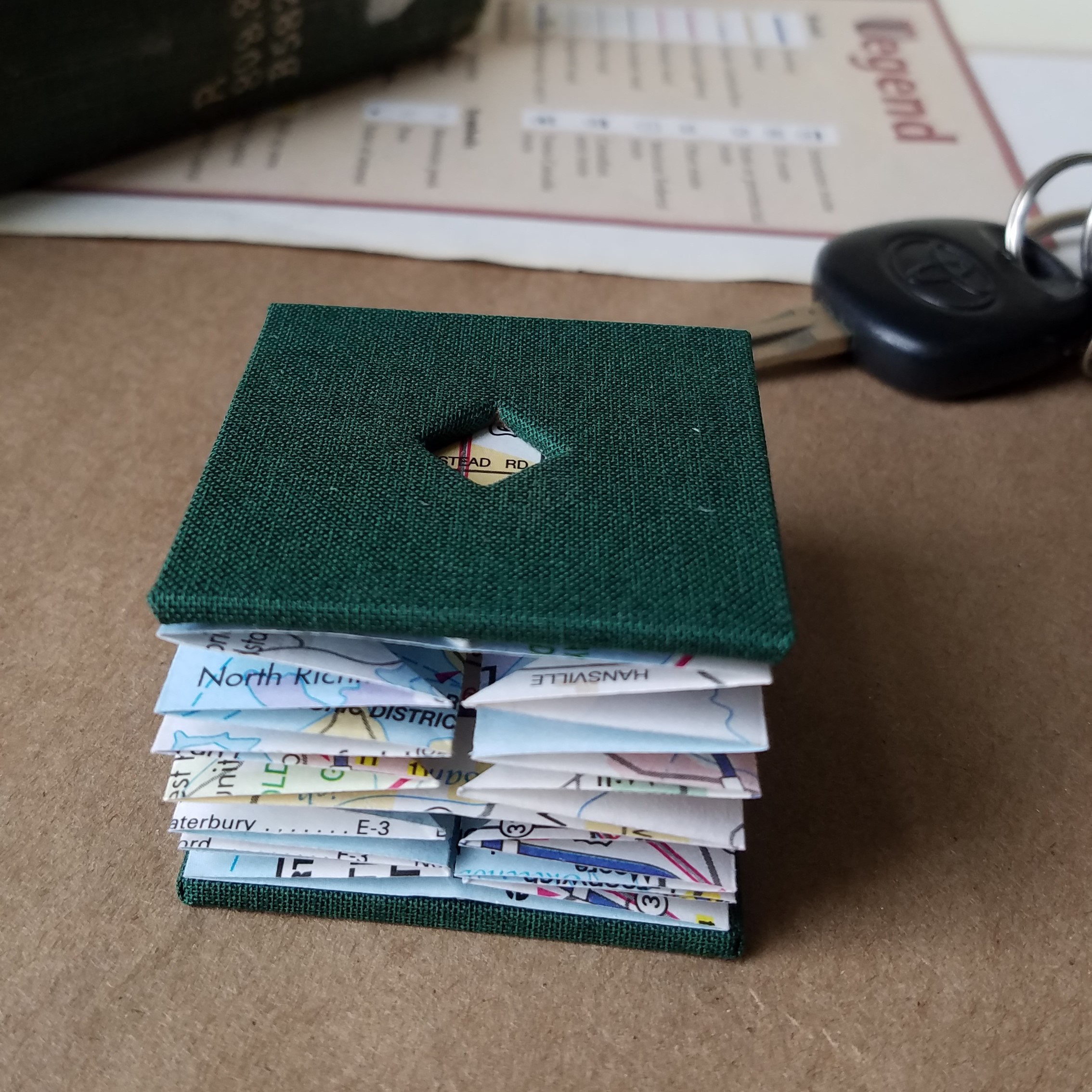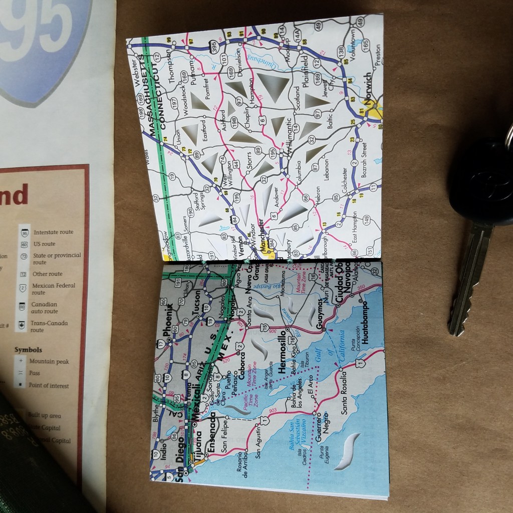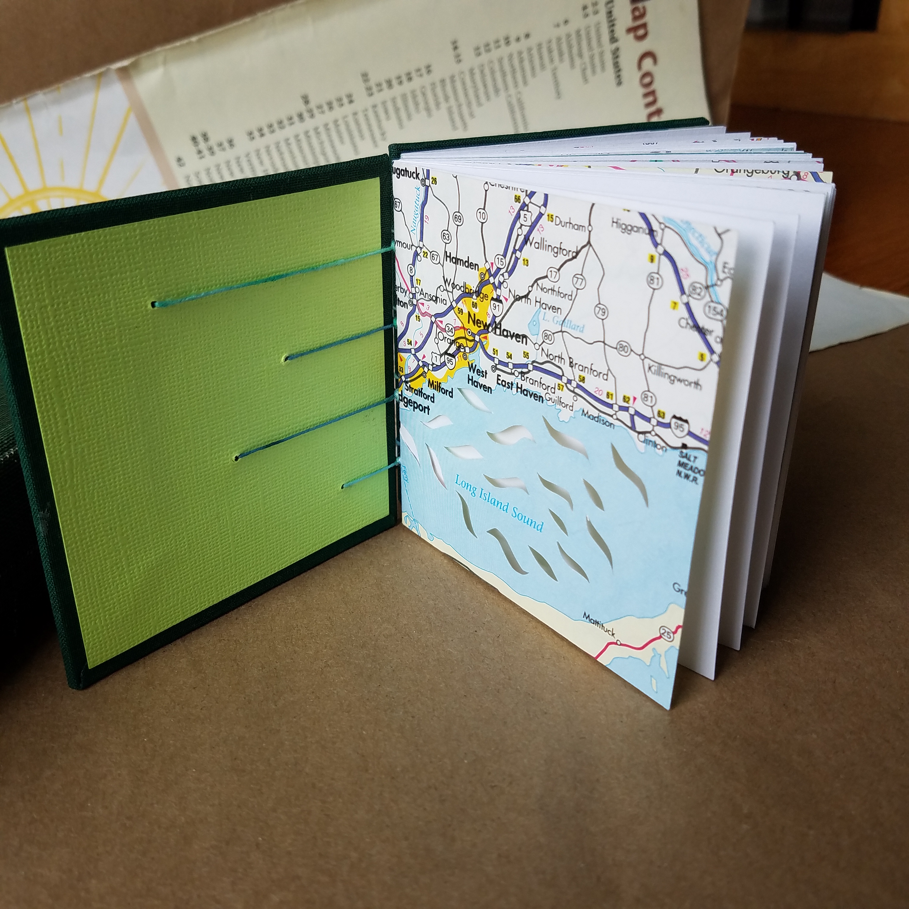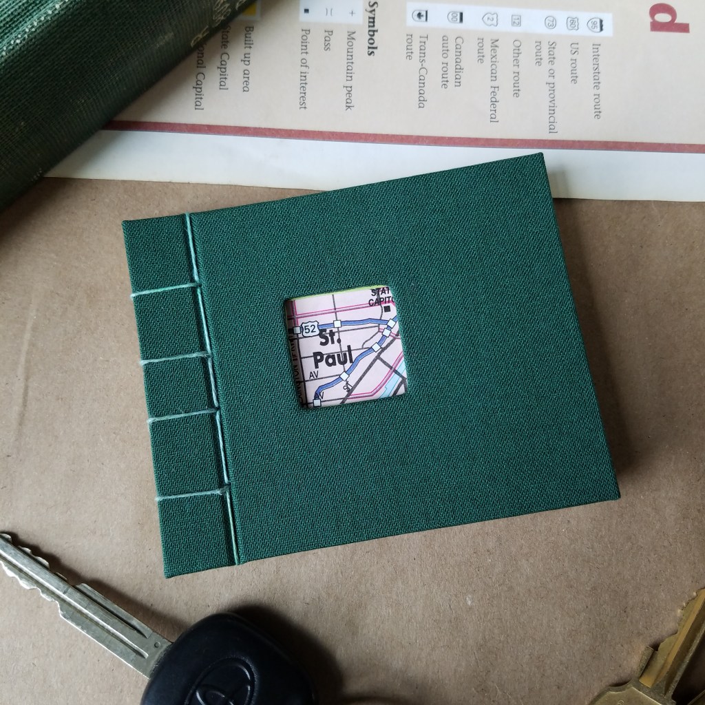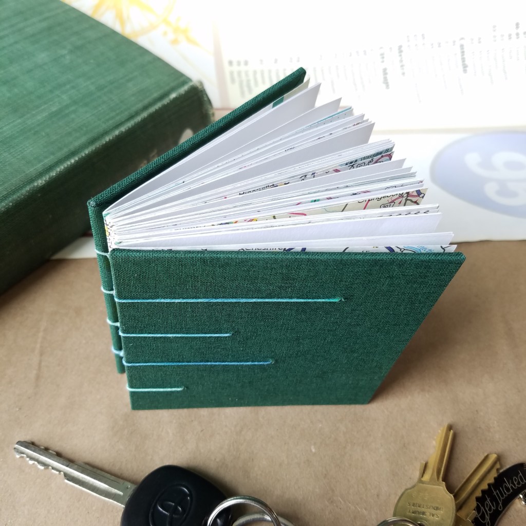 Maps 3 is a coptic-bound book, 4″x4″ square, with each signature wrapped in a laced atlas page.