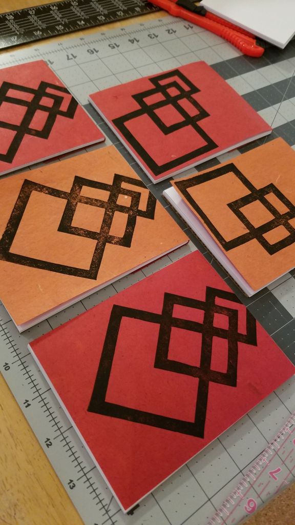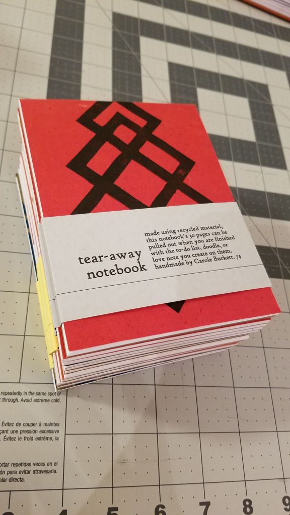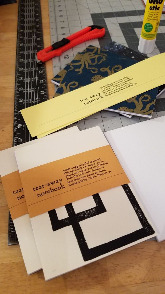 The second project was printing on decorative paper, which I bound into tear-away notebooks. Some of these are currently for sale at Calendula. I made a variety of orientations and colors.