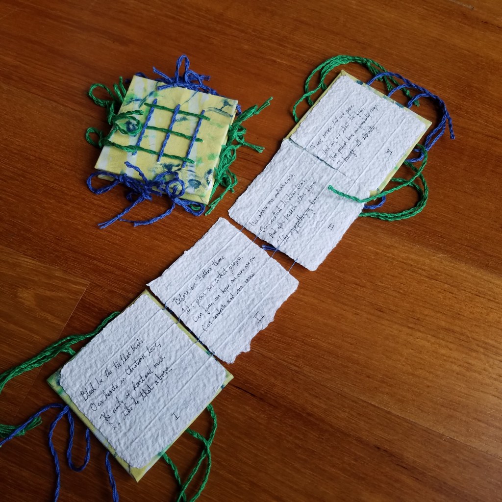 I used hand-dyed fabric my Mother made for the two covers, and wove cotton string through the covers to create both pattern and closure. The text block is handmade paper, couched with string between the two layers of pulp, to create a natural hinge and connection between each sheet.
