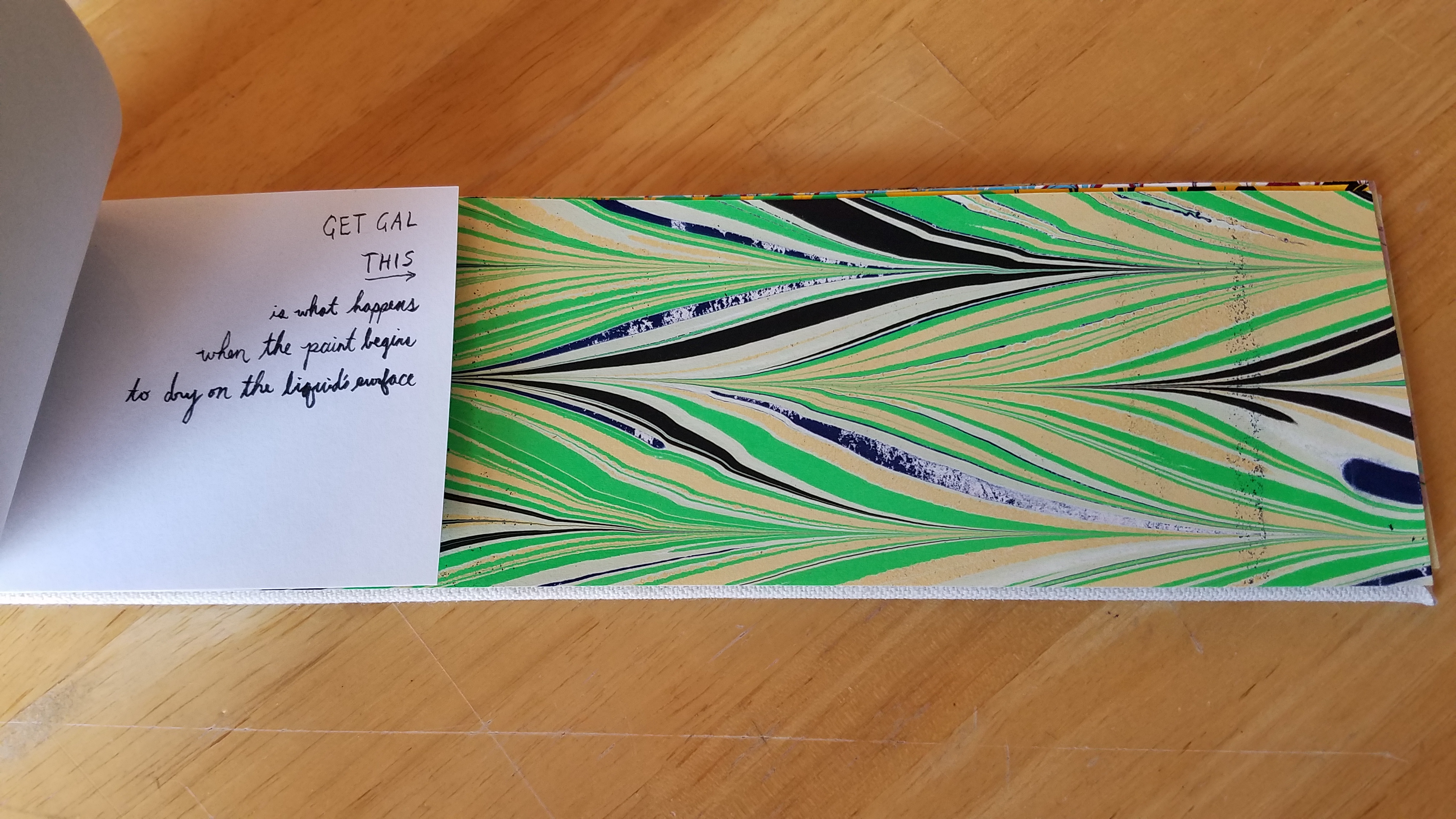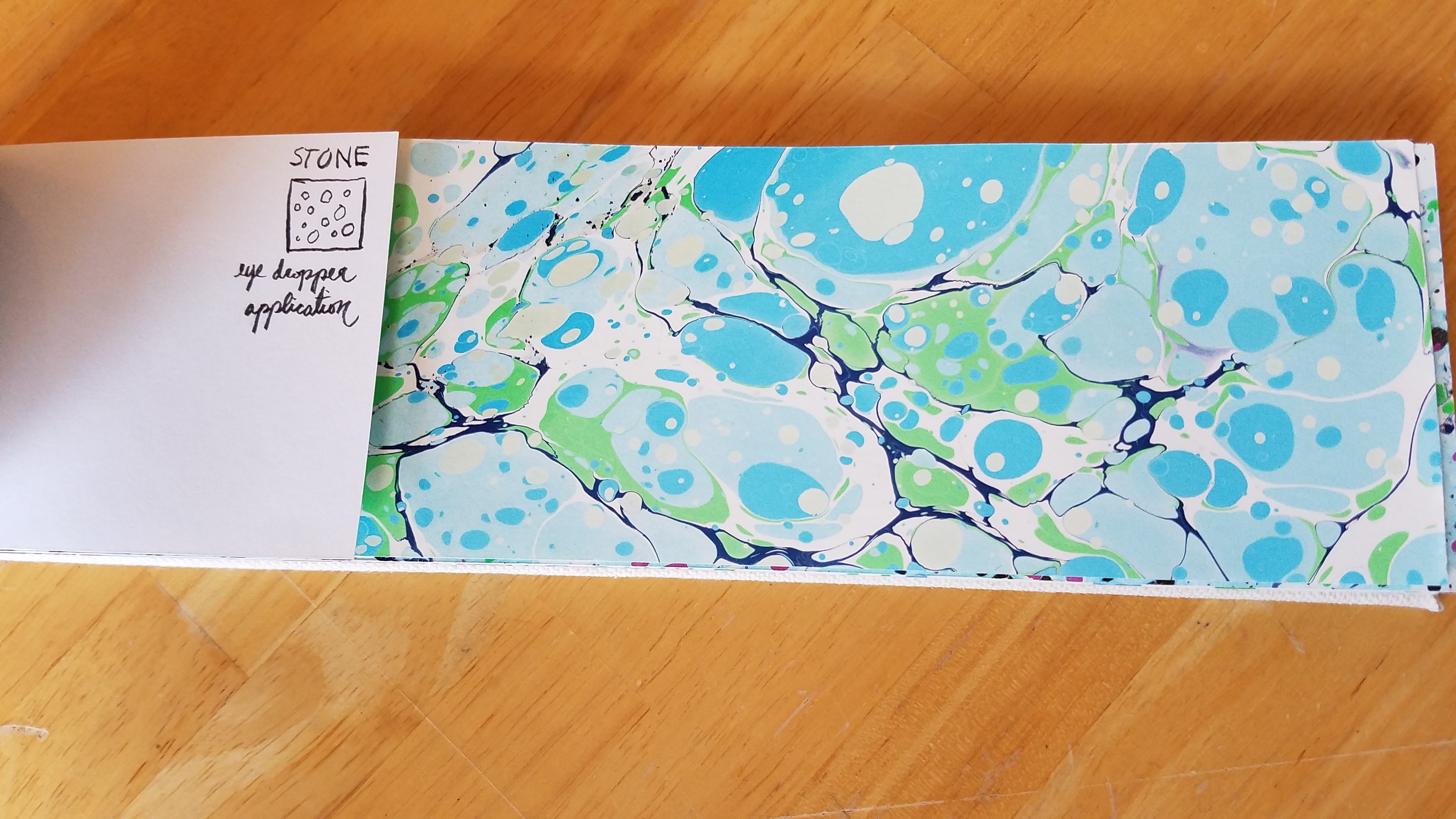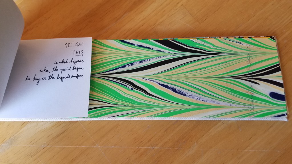 I learned to marble paper many months ago, and while it was a very enjoyable class, it left me with just as many examples of what not to do as what to do, and only a couple pages I liked. Still, it was a substantial stack, so I decided to bind samples together and note what had gone right, or wrong.