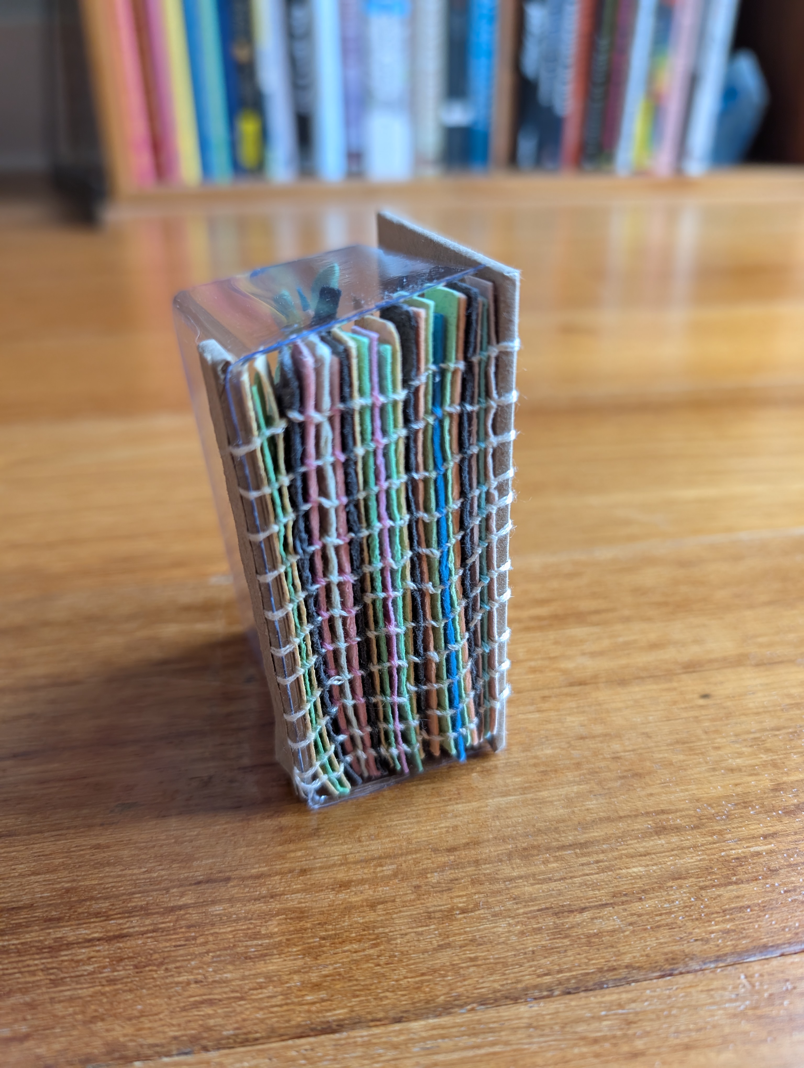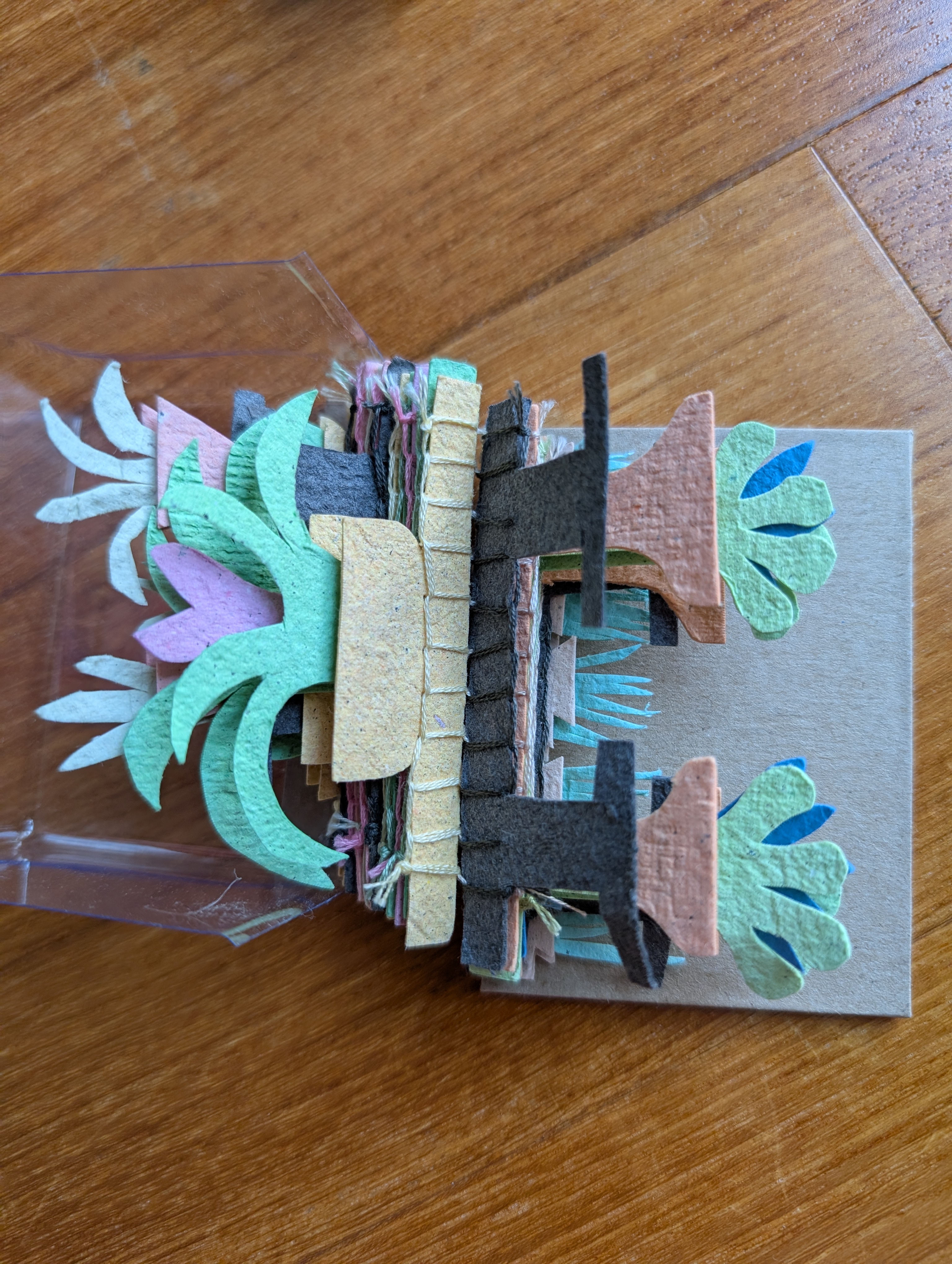 Handmade paper, cut into a variety of shapes of tables and pots and plants and blooms, sewn into a small booklet between a plastic cover and book board backing.
