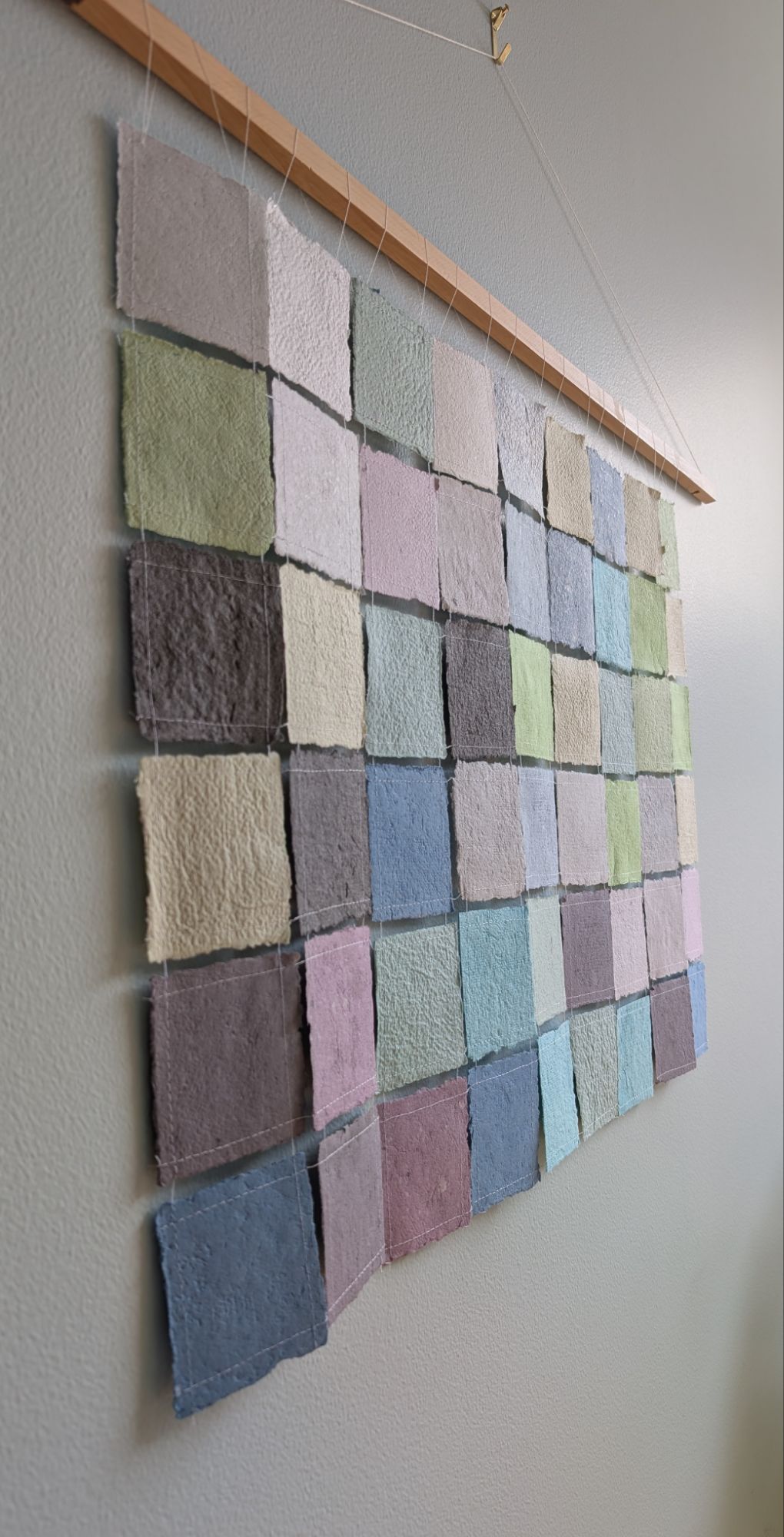 This paper tapestry is a combination of handmade paper squares, an abstract and pixelated vision inspired by a photo I took in Ashtabula County, Ohio, around 2010.